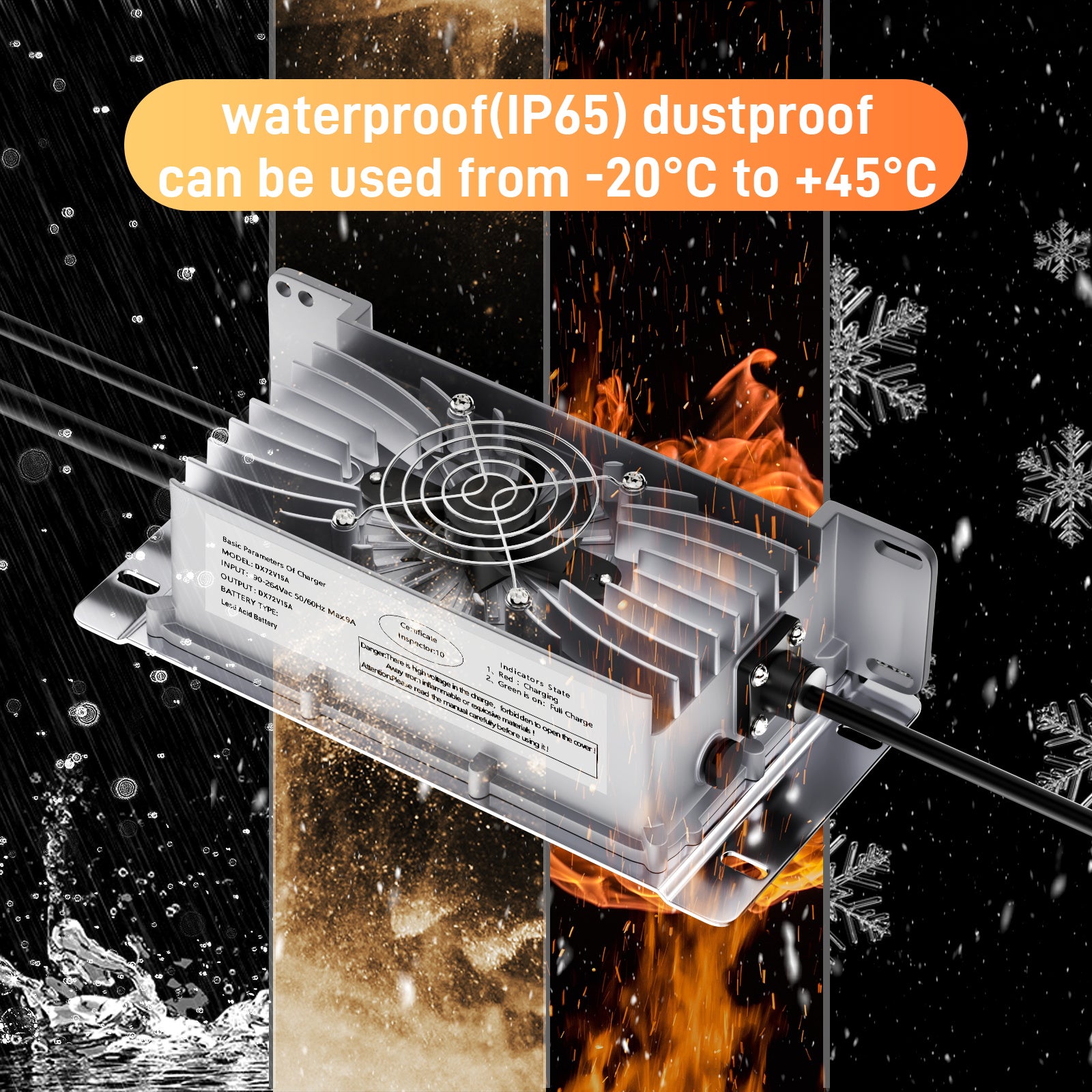 72V 15A Blei-Säure-Batterieladegerät, IP65 wasserdicht, mit Sicherungs-/Verriegelungskabel für Hubwagen, Bodenreinigungsmaschinen, Golfcarts und Gabelstapler