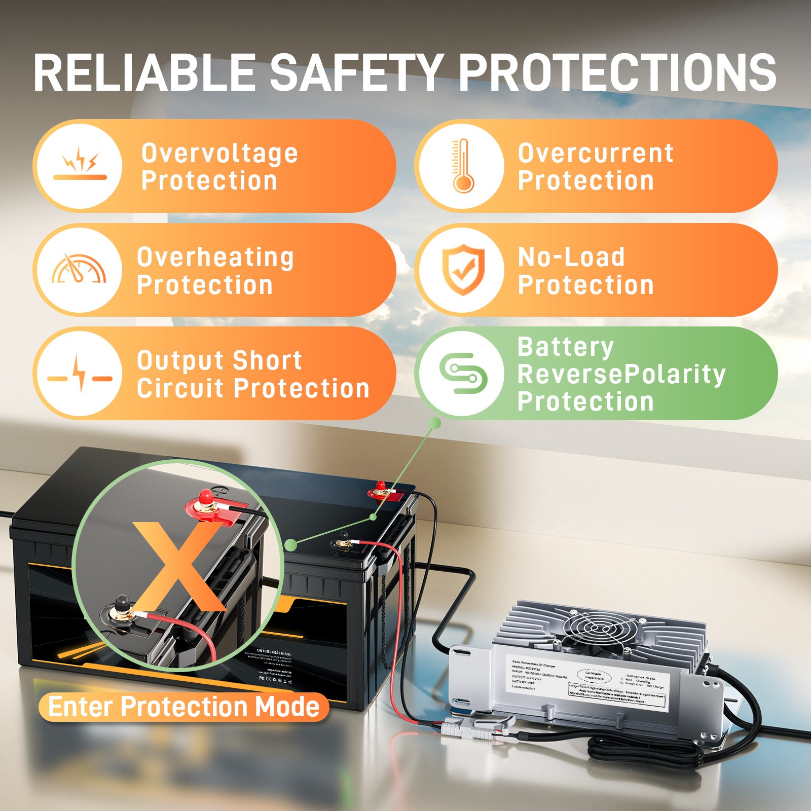 Einfach den Batterieanschluss stecken, den 220-V-Netzstecker einstecken, den Netzschalter einschalten – das Ladegerät führt dann eine 3-sekündige Selbstprüfung durch, liefert anschließend automatisch Strom und Spannung und stoppt die Ladung selbstständig, sobald die Batterie vollständig geladen ist.